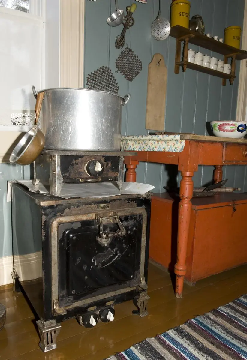 Gassbluss og gasstekeovn ble brukt til matlaging i byene fra slutten av 1800-årene, med konkurranse fra elektriske kokeplater fra ca. 1900. Gass- og elektriske komfyrer var vanlige i Oslo fra 1920-tallet. Formen var inspirert av vedkomfyren. Da emaljerte stålplater ble introdusert, fikk komfyrene lettere struktur og glattere overflate. Gass- og elektriske komfyrer gjorde matlagingen enklere, raskere og mer renslig, men endret ikke arbeidet.
