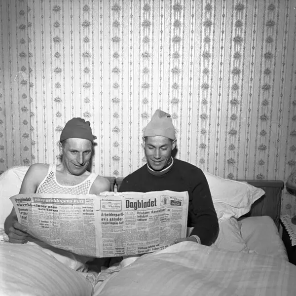 TIL SENGS MED DAGBLADET: Sverre Ingolf Haugli (t.v.) og Roald Aas (t.h.) deler broderlig på både seng og avis. Vi få tro de ikke leser om oslodamen det refereres til på forsiden, men har bladd direkte til sporten. Fotograf ukjent/Dagbladet | Norsk Folkemuseum