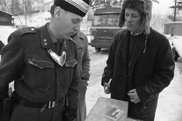 PÅ GLI’? Vakthavende befal gikk fra morsk til litt mindre morsk da Lasse Efskind satte opp en salgsstand for «Soldatens lille røde» utenfor Gardeleiren i november 1970, men det ble neppe så mye penger i kassa likevel. Odd H. Anthonsen | Dagbladet - Norsk Folkemuseum