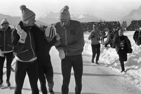 SLITEN: Dag Fornæss har gitt alt under EM i Innsbruck 1970. Fotografen lengst til høyre skal snart kjenne på det samme. Fotograf ukjent/Dagbladet | Norsk Folkemuseum