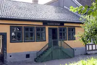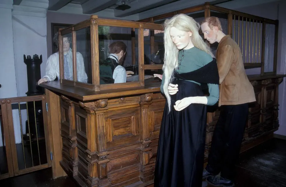 Banklokalet slik det så ut da utstillingen åpnet i 2009. I dag er figurene fjernet.