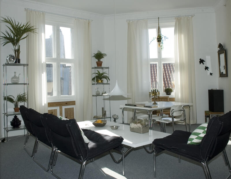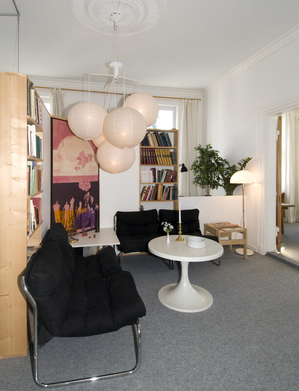Som delvis hjemmearbeidende arkitekter, trengte de et godt arbeidsrom med plass til tegnebord og godt lys. Det opprinnelige kontoret ble for lite og de bygget derfor en reol i den ene stua som besto av selvlagde bokhyller som skilte mellom kontor- og stuesonen, uten å ødelegge rommets helhet. En hjemmelaget «lysekrone», bestående av fire rislamper fra IKEA og oppadlysende spoter hengende i et kryss av elektrikerrør i plast, underskreket rommets sentrum.