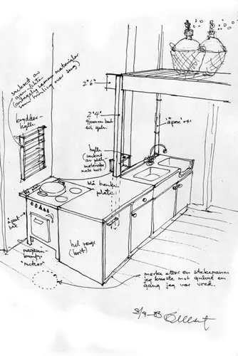 Den opprinnelige kjøkkenbenken som sto igjen fra byggeåret ble pusset opp sammen med overskap fra 1930-tallet, underskap fra 1950-tallet og oppvaskbenk fra 1960-tallet. Gamle malingslag ble fjernet, furu fikk være furu med signalrødt og signalblått som kontrastfarger på vegger og skap. Kottet foran badet ble bygd inn i kjøkkenet og gjort om til daybed/gjesteværelse. Det gamle tregulvet var dessverre borte og erstattet med et praktisk, kjedelig støpt gulv. Men de ville ha tregulv. Økonomien på det tidspunktet tillot 15mm gran rupanel, som ved et uhell ble tilsølt med rødvin. Og siden fargen på rødvinsflekken var så fin, «beiset» de like godt hele gulvet med rødvin! Vin var imidlertid dyrt, mens vinballonger var billig på loppemarked. De bygde derfor en egen vinhems til vinproduksjon på kjøkkenet.