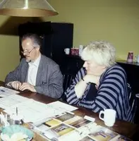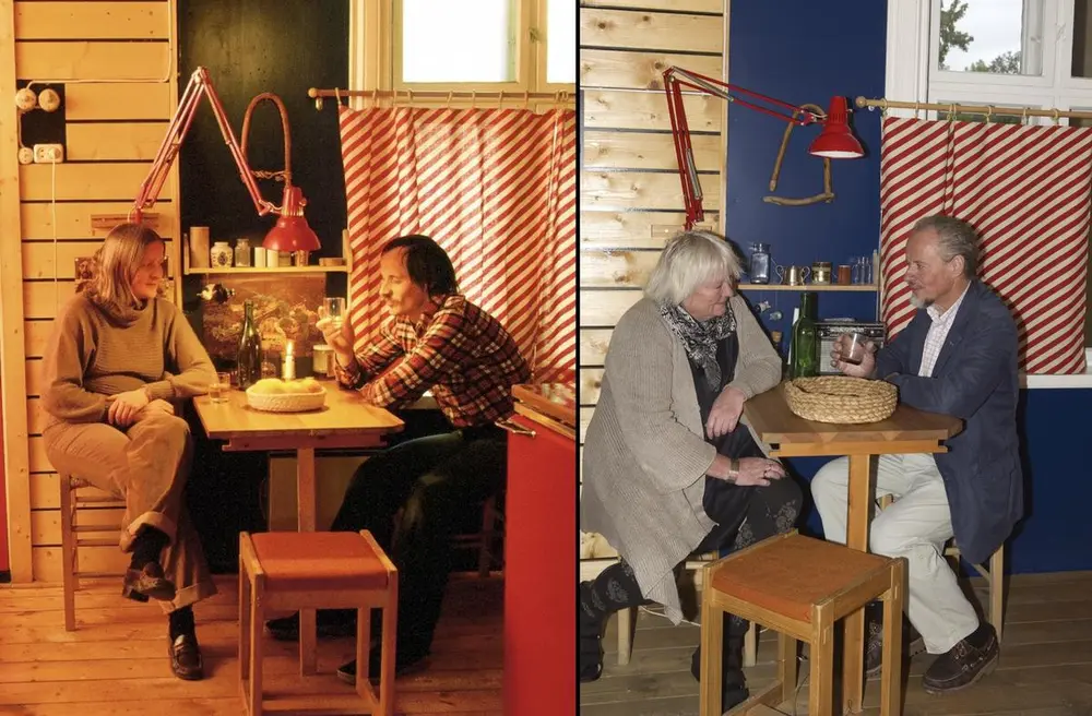 Til venstre: Tove Kvalstad og Ola Ulset på,kjøkkenet sitt i Wessels gate 15 i 1979. Foto: Jan Larssen/Bonytt - Norsk Folkemuseum. Til høyre: Tove og Ola på kjøkkenet sitt på.museet i 2011. Foto: Anne-Lise Reinsfelt/Norsk Folkemuseum.