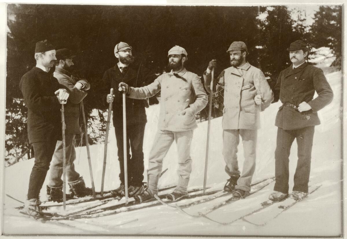 Medlemmer av Christiania Skiklubb fotografert i Skiforeningens stiftelsesår 1883. Ukjent fotograf | Norsk Folkemuseum