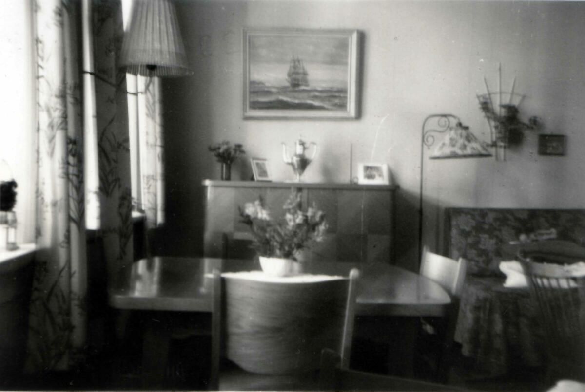 Det var to værelser og kjøkken vi hadde, og så en lang gang utenfor, og en lang trapp opp ifra gården helt opp i annen etasje. Det var en alminnelig stor stue med to vinduer, og et soveværelse med ett vindu innafor den igjen. Vi hadde alminnelige putestoler med løse seter på, huser jeg vi hadde i mange år. Og vi hadde en meget fin sånn pidestall vi kalte den gangen, rundt bord og sofa og forskjellig.