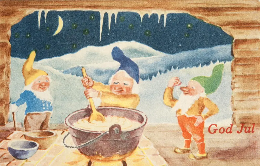 Julekort illustrert av Paul Lillo-Stenberg (1883-1981). Som et resultat av tyskernes forbud mot røde nisseluer, begynte kunstnerne å tegne julenisser med luer i andre farger.