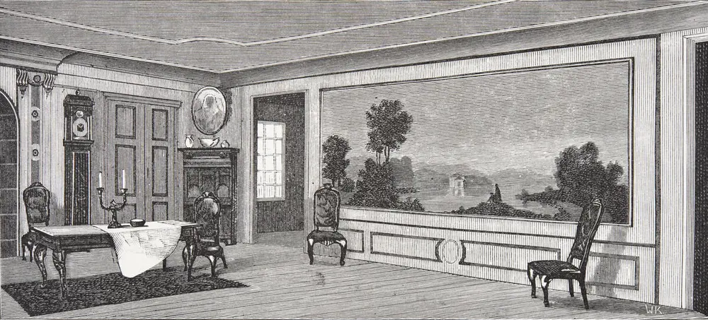 Rekonstruksjon av salen i annen etasje i Collettgården, slik den kunne ha sett ut ca. 1740. Illustrasjon fra Ludvig Daae: Det gamle Christiania, 1891. «Værelserne var, som det sees av skifteprotokollen i Riksarkivet, staselig møblert med høiryggede ruslærs stoler, damaskes forhæng, 'Gueridon’er', (lampetholdere), forgyldte skaper, hollandske skaper av valnøttræ, engelske dragkister, speiler med glasramme eller forgyldt eller sort lakert ramme og guldkrone over, slagurverk, løibænker, røde plysjes taburetter og lænestoler, 13 familieportætter og en del 'hollandske Skilderier' o.s.v. Til de spinkle, lakerte engelske møbler som den gang saa smaat havde begyndt at faa indpas, ser man endnu ikke noget spor i dette mer gammeldagse hjem, og her optræder heller ikke den lette, lystige rokoko, som hos den næste generation i stor utstækning avløste den tunge barokstil.»