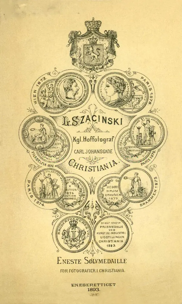 Fotografen Ludwik Szacinskis visittkort. Gjennom sin faglige dyktighet og sine betydelige sosiale evner etablerte den polskfødte Szacinski (1844–1894) seg raskt som Norges fremste sosietetsfotograf. Visittkortet reklamerer friskt med hans fornemme tittel som «Kgl. Hoffotograf» og hans mange medaljer og utmerkelser på utstillinger i inn- og utland. Etter hans død videreførte enken Hulda (1844–1922), født Hansen, firmaet med stor suksess til 1916.