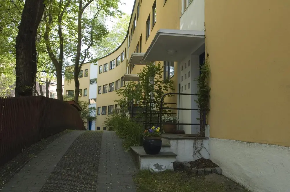 Boligblokk i Professor Dahls gate 33 i Oslo, tegnet av Frithjof Reppen og oppført 1929–1932. De tidligste funksjonalistiske boligene i Oslo var bygd for relativt velstående mennesker. Denne og den nesten identiske naboblokka blir på folkemunne kalt «bananene». Anne-Lise Reinsfelt | Norsk Folkemuseum