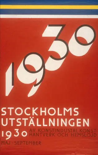 Sigurd Lewerentz: utstillingsplakat for «Stockholmsutställningen». Utstillingen, som var arrangert av Svenska Slöjdföreningen, åpnet i Djurgårdsviken i den svenske hovedstaden 16. mai 1930. Den kontroversielle og debatterte utstillingen delte svensk, og også norsk, kulturliv inn i to leire – modernister og tradisjonalister – og signaliserte den modernistiske arkitekturens gjennombrudd i Skandinavia. Hverdagsgjenstander i dristig, ny design fylte haller, villaer og leiligheter og vitnet om utstillingens sosiale ambisjoner Arkitekturmuseet, Stockholm.