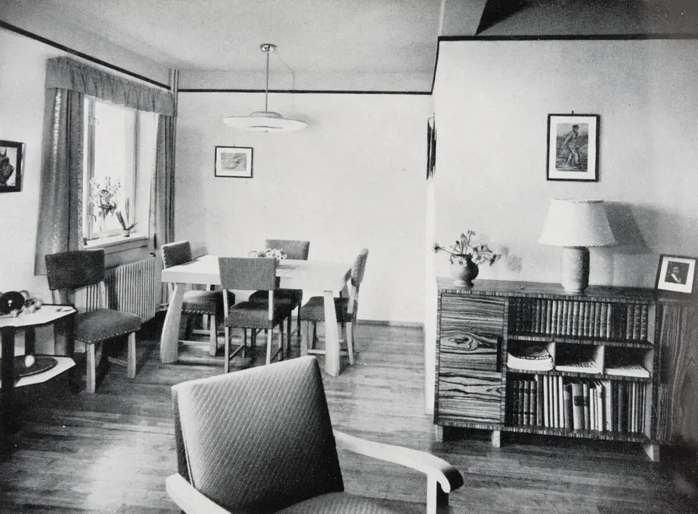 Fra den kombinerte stua og spisestua i arkitekt Eilif Dahls hjem i Briskebyveien 22c i Oslo. «Stuen vår er jo deilig lys med store vinduer. I en lys stue bør det være lyse tapeter, gjerne hvite så alle farver og gjenstander kommer til sin rett. Vi valgte et tapet med en struktur som skvettpuss. Fløtegul på hvit bunn. De to sidevegger i spisekroken svak eplegrønn, som gir en morsom variasjon og hvorved også rummet virker større. Taket er kanarigult med mørkebrune billedlister. Vinduskarmer kremgule som tapetet.» Fotografi fra «Hus og Have», mai 1934.