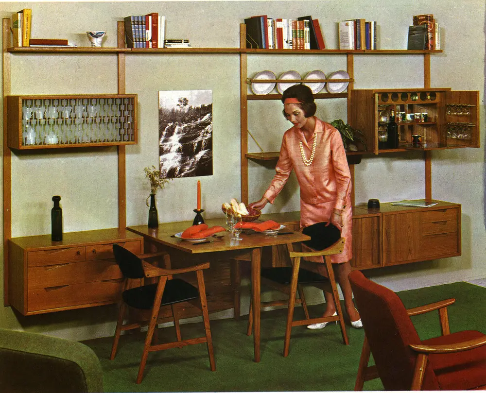 På 1960-tallet var teak det desidert mest populære treslaget, både i møbler og ulike gjenstander som ble brukt i hjemmet. Annonse for Rival byggemøbler fra Brødrene Jåtogs møbelfabrikk i Farsund i boken BO BEDRE – lev lettere, utgitt av Krigsinvalideforbundet i 1965.