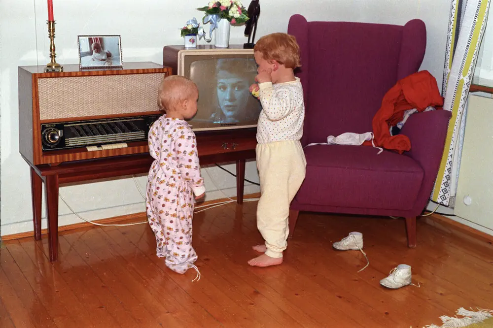 Christine og Anne-Line Ellingsen foran fjernsynet på Bøler i Oslo, september 1964. Fjernsynet fikk raskt et voldsomt gjennomslag i Norge. Allerede i 1965 hadde nesten 500 000 løst lisens. TV-apparatet ble et sentralt innslag i stuene, som resten av møbleringen orienterte seg rundt. Ukjent fotograf | Norsk Folkemuseum