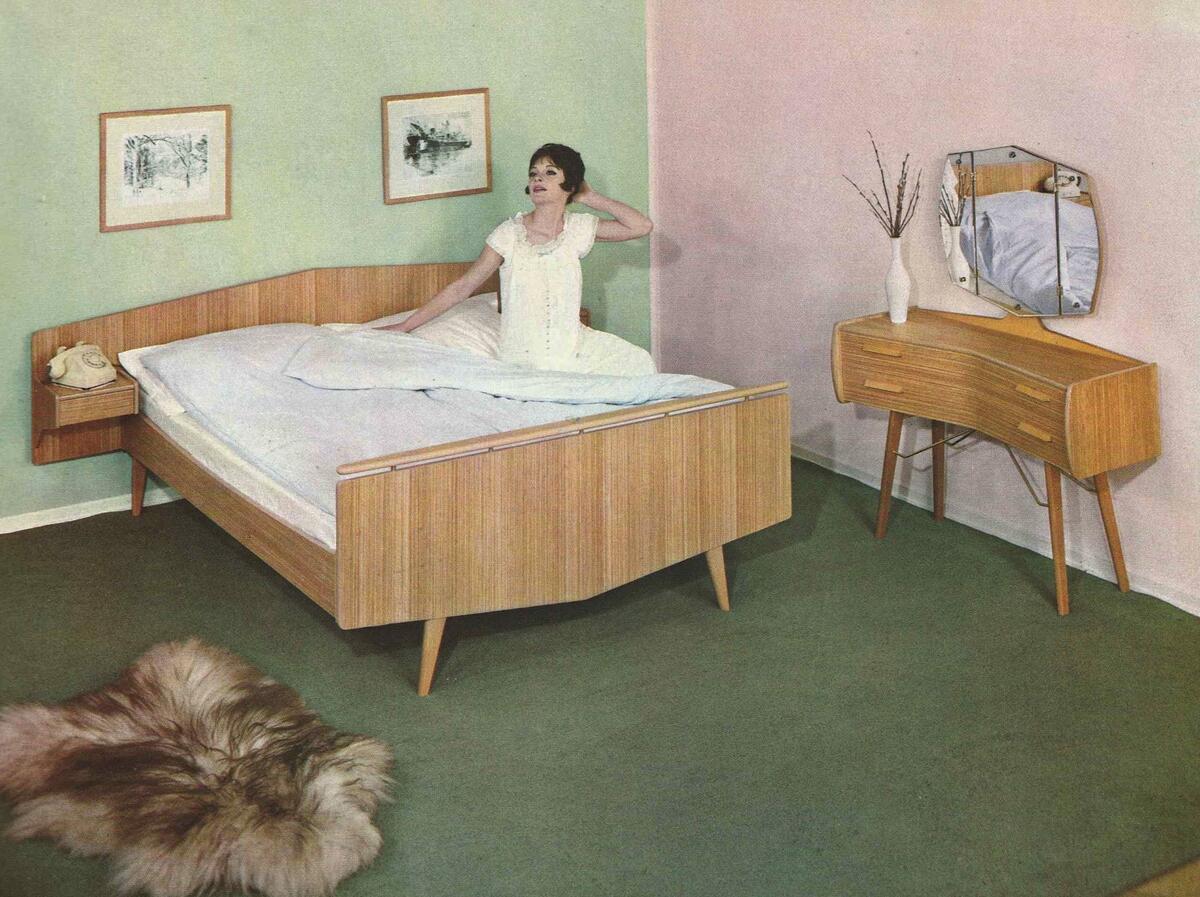 På slutten av 1950-tallet hadde svært mange byttet ut divanen på stua med senger isoveværelset. Møbleringen på soveværelset besto gjerne av to senger, nattbord og toalettbord,pluss eventuelt kommode og puffer. Først fra 1960årene begynner dobbeltsenga å bli vanlig, og fortrenger de to sengene som var stilt inntil hverandre, men også kunne flyttes fra hverandre.