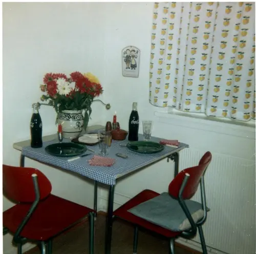 I denne leiligheten på Manglerud ca 1960 var det dekket opp til middag på respatexbord på kjøkkenet. Ukjent fotograf | Norsk Folkemuseum