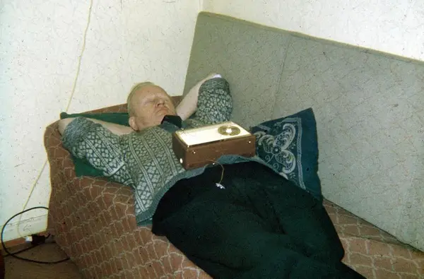 Otto Nordby sover middagslur på divanen, 1964. Divanen har formsydd trekk og løsrygg. Selv om divanen definitivt var falt i «unåde» blant arkitekter og innredningseksperter på denne tiden, var den fortsatt i bruk i mange hjem, særlig blant godt voksne mennesker. Morten Bing | Norsk Folkemuseum