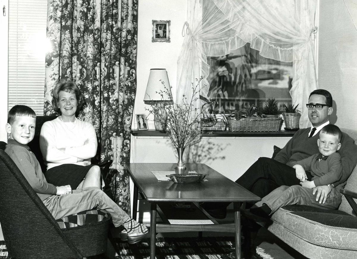 Stua hos familien Hannevik på Manglerud i Oslo, 1964. Fotografi fra en reportasje om drabantbyliv i det danske bladet Boligen (som tilsvarer OBOS-bladet i Norge). Ukjent fotograf | Norsk Folkemuseum