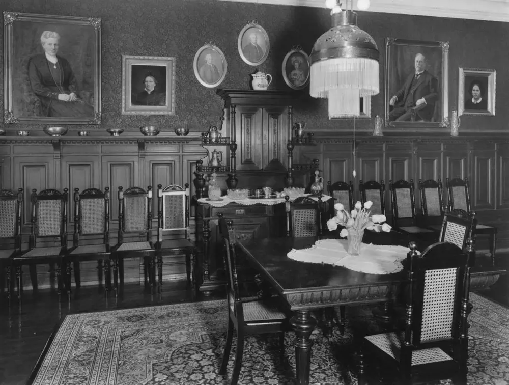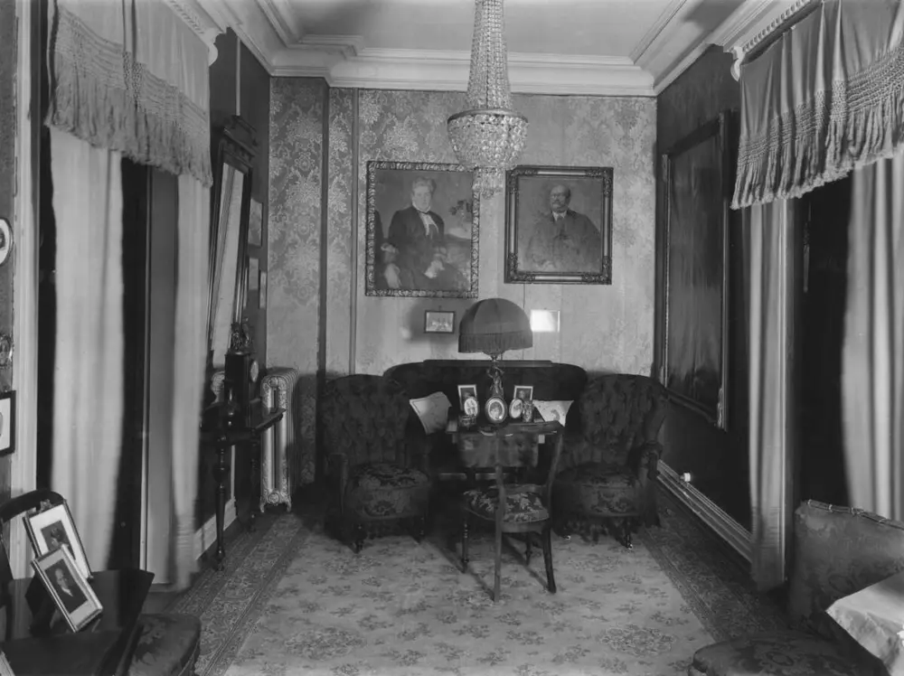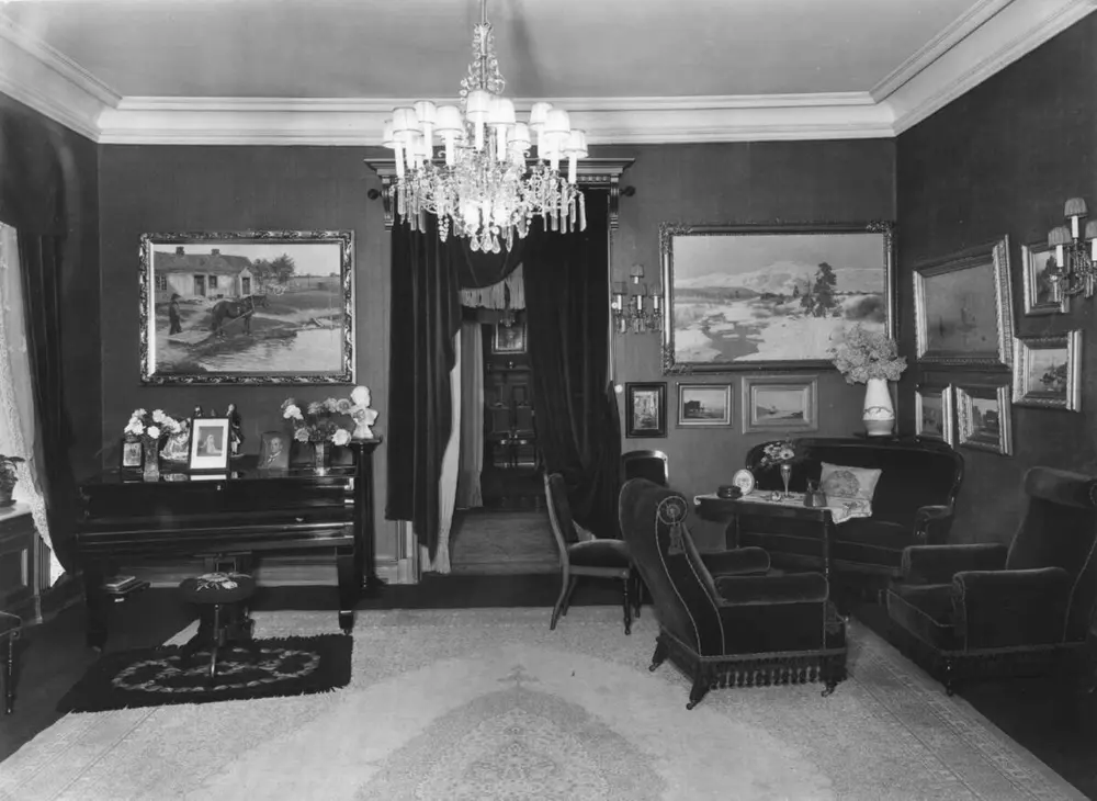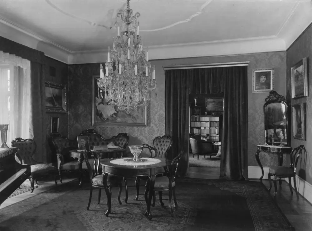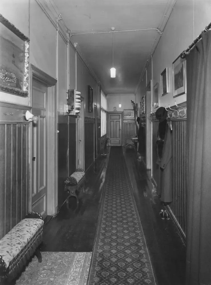 Gangen i Christine og Alf Bjerckes hjem, 1933. Christine Amalie Hesselberg og Alf Bjercke ble gift i 1879. I 1899 flyttet de inn i en nybygd leiegård i Bygdøy allé 19. Hjemmet deres var preget av den borgerlig boskikken i siste del av 1800-tallet. Det var et klart skille mellom den representative delen av leiligheten – som omfattet en velutstyrt stue i nyrokkoko og en spisestue i nyrenessansestil – og de private rommene som kjøkken og soverom på den andre siden av korridoren. O. Væring | Norsk Folkemuseum