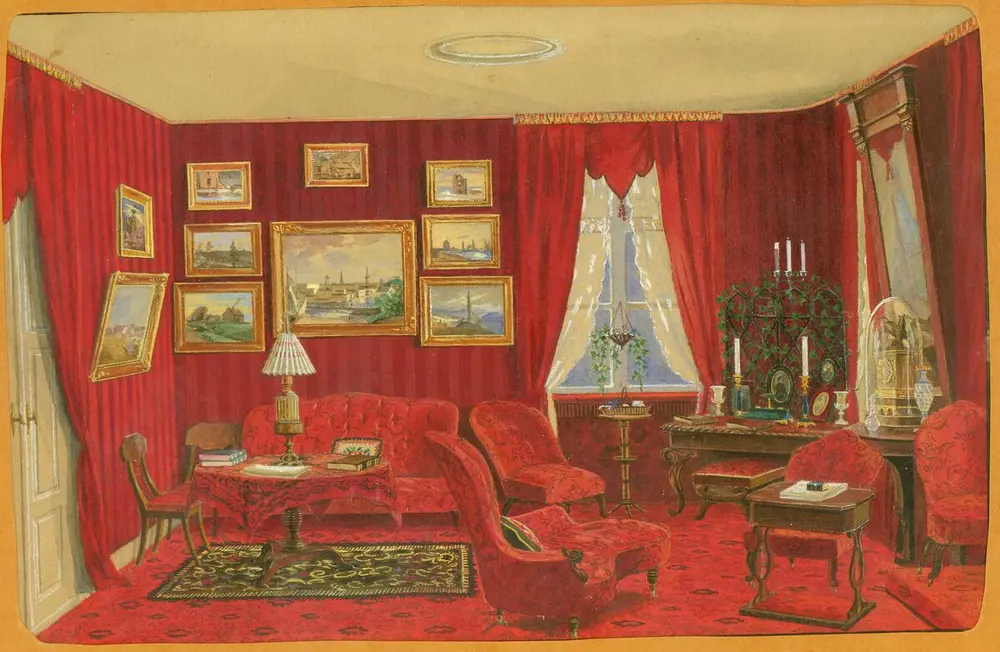 Interiør fra Nicoline og Jacob Tostrups leilighet i Kristiania. Akvarell av Torolf Prytz fra 1880-årene. Tilhører Norsk Folkemuseum. Jacob Tostrup var født i 1806 og giftet seg i 1839 med den 15 år yngre Nicoline. Bildet viser derfor et hjem som i 1880-årene var gammeldags og preget av forrige generasjons stiluttrykk. Norsk Folkemuseum