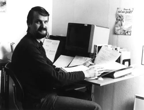Jon Birger Østby med museets nyinnkjøpte datautstyr i 1984. Anne-Lise Reinsfelt | Norsk Folkemuseum