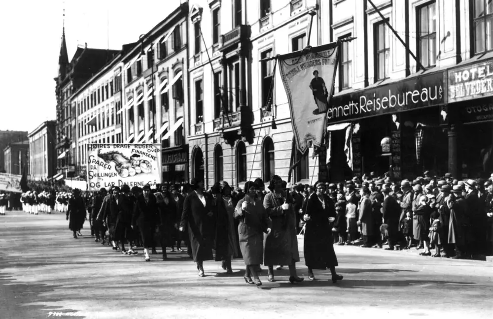 1. mai-toget på Karl Johans gate i Oslo, 1930. Mellomkrigstiden var både de store klassemotsetningenes og den begynnende klasseutjevningens tid. H. C. Neupert | Norsk Folkemuseum