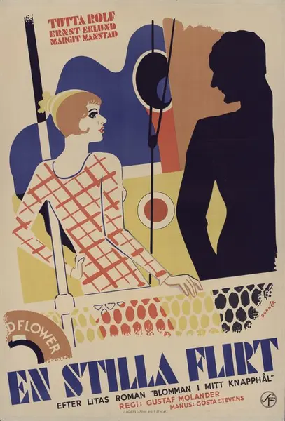 Plakat for den svenske spillefilmen En stilla flirt fra 1934, med norske Tutta Rolf i hovedrollen. Filmen var en av 1930-årenes største suksesser, som også kom i en norsk versjon, og tittelmelodien ble en stor slager. Tilhører Nasjonalbiblioteket.