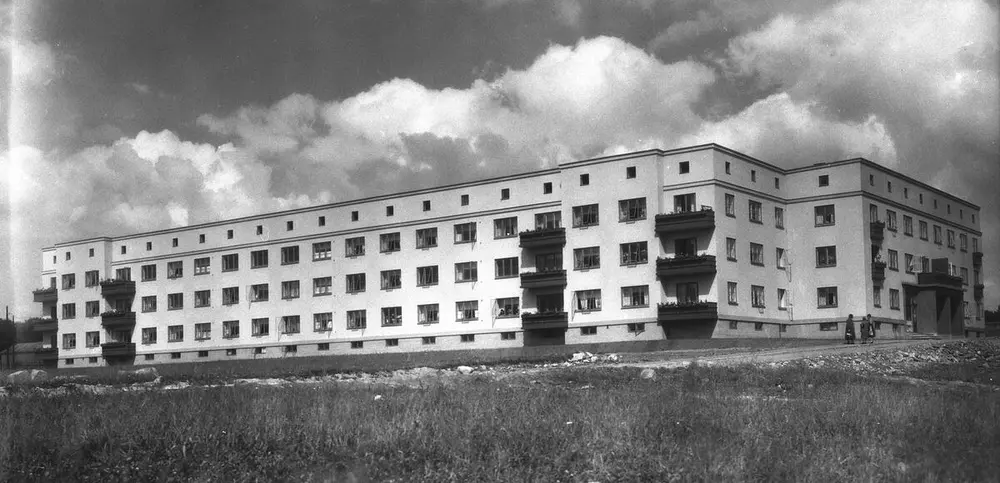 Boligkomplekset Etterstad I i Oslo, 1931. «Etterstadslottet», med adresse Etterstadsletta 4, regnes som den eldste OBOS-blokka. Den var tegnet av Jacob Christie Kielland og sto klar til innflytting samme år som bildet ble tatt. Etterstad var det første skrittet mot en ny organisering av boligbyggingen og representerte også en overgangstid med hensyn til arkitektonisk utforming og teknisk utstyr. Fasaden er en blanding av klassisisme og funksjonalisme, og alle leilighetene hadde elektriske komfyr og varmtvannsbeholder, men ble varmet opp av vedovner. A. B. Wilse | Norsk Folkemuseum