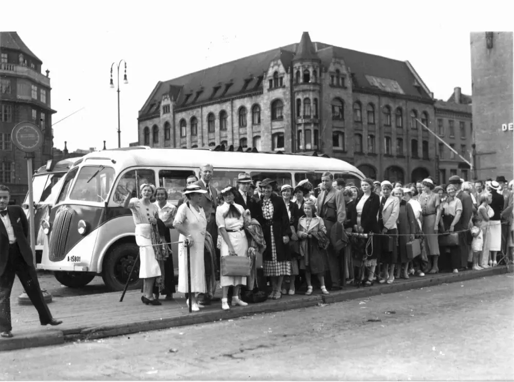 Jernbanetorget i Oslo,1937. Sommerkledde barn, kvinner og menn i kø for buss til Ingierstrand H. C. Neupert | Norsk Folkemuseum