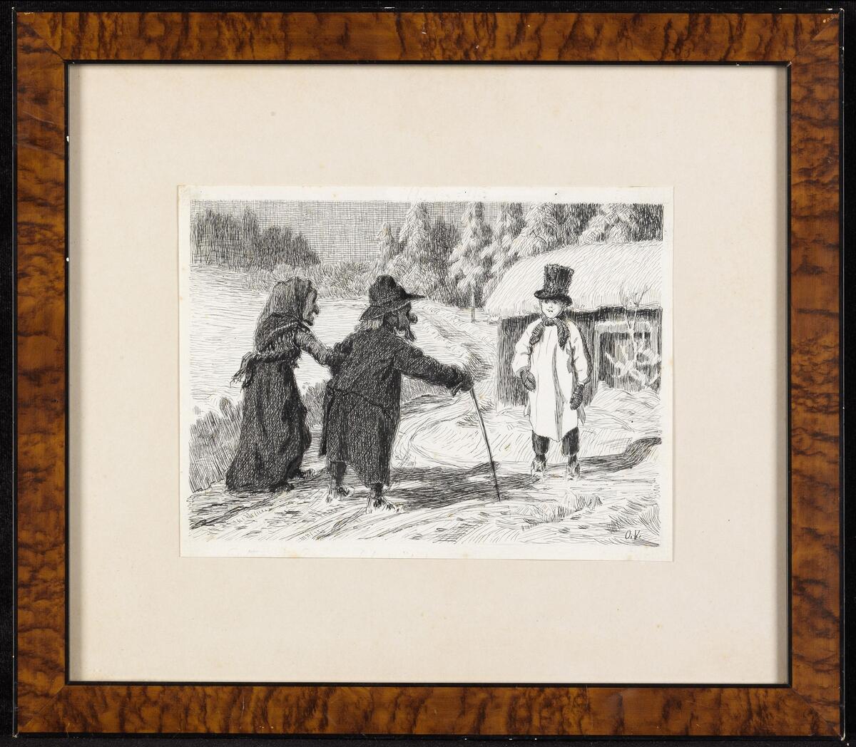 «Julebukker møtes». Tusjtegning av Otto Valstad (1862-1950). Asker Museum, Akershusmuseet