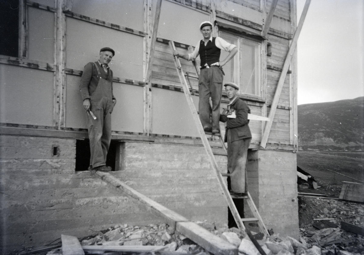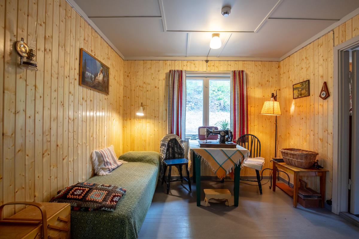 The sewing machine at the table has belonged to Lillian Greiner Petterson in Brennelv in Porsanger. The sewing machine was dug into the sand floor of the family garage before the forced evacuation. When they returned to the burnt-down property after the war, they could dig out the sewing machine. The family built a new house below the road after the war and now the sewing machine was again in use. Haakon Harriss | Norsk Folkemuseum