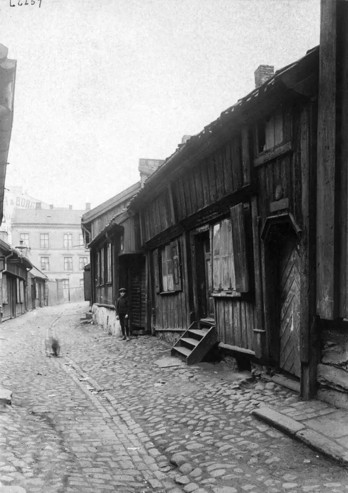 Smalgangen, a little side street at Grønland, had the district’s oldest buildings. Houses with overhanging upper stories were common in the 1700s in both town and suburb.