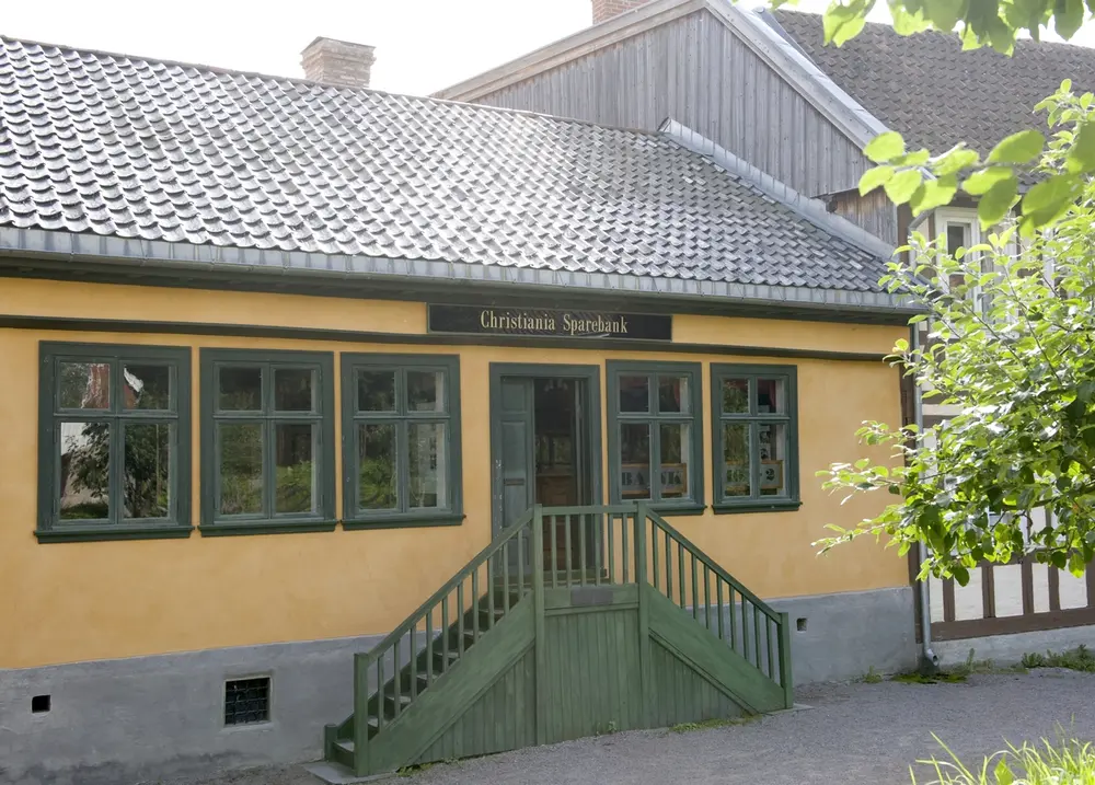 A new entrance was built and windows and doors replaced when the housewas taken over for offices around 1900. The building now houses an exhibitionon Norwegian savings banks and shows a branch office as it might have lookedaround 1900.