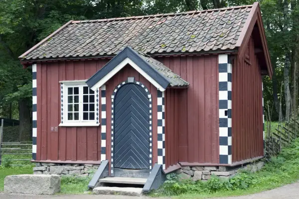 This one-room building with outer porch has a richly decorated interior. The beds and cupboards carved in flat relief are original, as is the corner fireplace.The walls have been decorated by one of Telemark’s most famous «rosepainters», Olav Hansson. Each wall has its own design, each encircled by «roses»: the chained beast from Revelations, the Fall, Samson and the lion, and, finally, a more everyday scene showing a farmer and a timber surveyor.