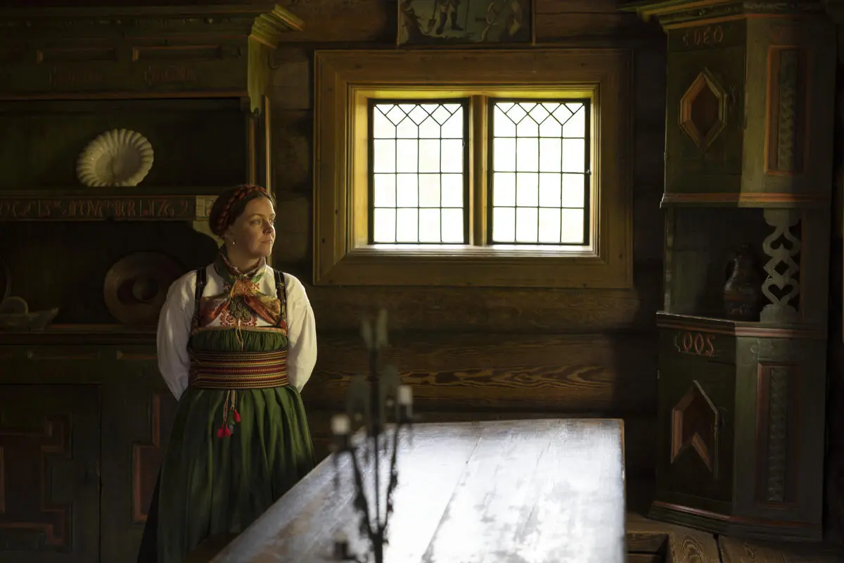 Although this is a festive hall, its ground plan follows the tradition for three-room houses. A gallery has been built in front of the entry door and around the one side. The carpentry is of extremely high quality.