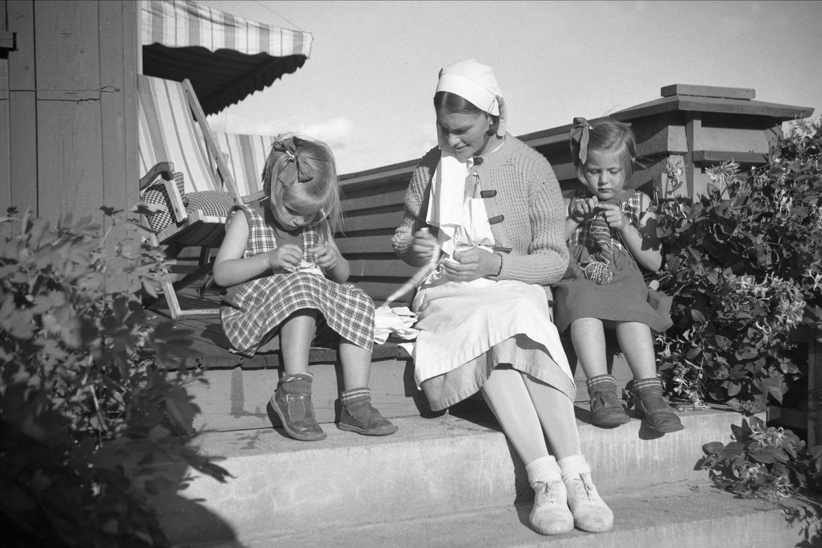 Two little girls with their nanny, knitting. 1935. Fritjof Arentz | Norsk Folkemuseum