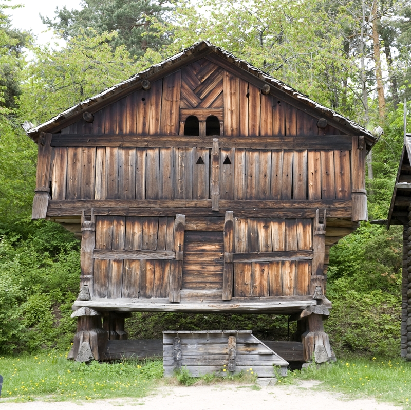 The ground floor of this storehouse, the bur, is the oldest part and built around 1209.This was where food was stored. The upper story, the loft, was a storage room for clothing and textiles, and had also beds. The log core of the building is encircled by a stave-built gallery. When the bur was first built, it stood directly on large stones or a low foundation. The building was lifted up in the 1700s and placed on wooden pillars, or stabber.