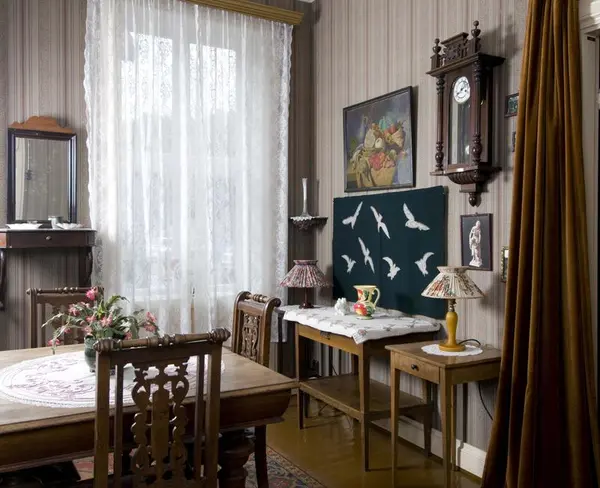 Gunda's combined living room and bedroom with plain and cheap furniture. Her divan is simply a bed of iron with a mattress and embroidered pillows. On the table the Bible she was given at Sunday school. The dining room furniture made of oak in late neo-renaissance was bought second hand at Gunda's wedding in 1924.