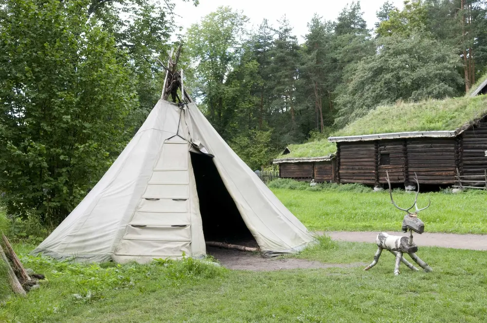 The cloth of many of the modern tents is held up by a construction of metal tent poles. Here traditional birch-wood poles are used and locked together at the top by forks in the branches. This construction is relatively simple, and this kind of tent was mostly used during shorter periods while herding or moving. The museum’s lavvo is used for different activities and does not illustrate any particular historic period.