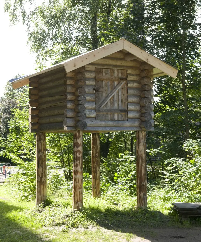 The storehouse, or buvrie, stands on poles or, often, on still rooted tree trunks. The Sami of the far north also used a njalla, a type of storehouse built on top of a two- to three-meter-high tree trunk. A slanted log with steps was then used as a ladder and removed on departing from the site. The Southern Sami storehouse, usually lower and larger than those in the north, stood on two, three or four sturdy poles. This storehouse was built by Jonas Danielsen.