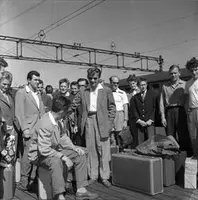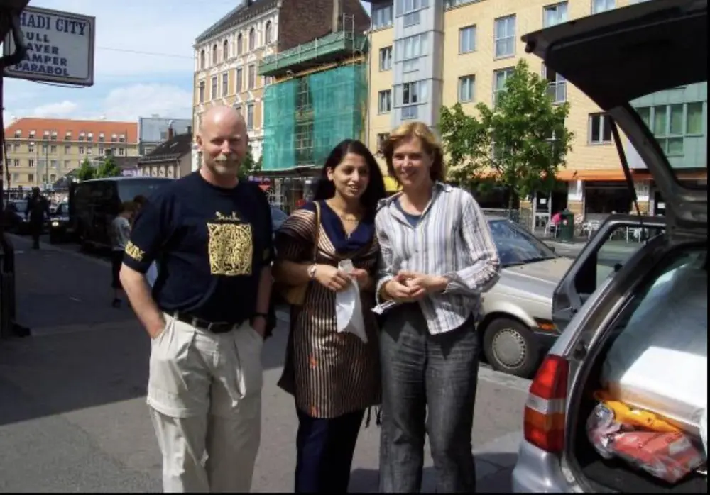 Konservatorene Leif Pareli og Birte Sandvik på handletur sammen med Zubi Ullah (midt i bildet) Ukjent fotograf | Norsk Folkemuseum