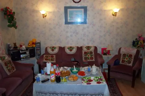 Stua hos familien Ullah på Tøyen, 2002. Bildet ble tatt i forbindelse med feltarbeidet til "Et pakistansk hjem i Norge – 2002". Familien har bodd i leiligheten siden 1970-tallet, og alle de fem barna vokste opp der. Hjemmet deres dannet utgangspunktet for innredningen av den pakistanske leiligheten i Wessels gate 15, uten å bli direkte kopiert. Leif Pareli | Norsk Folkemuseum