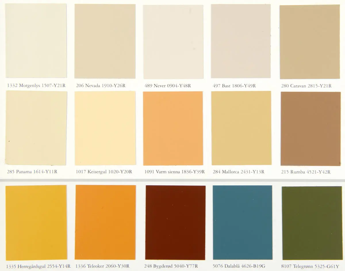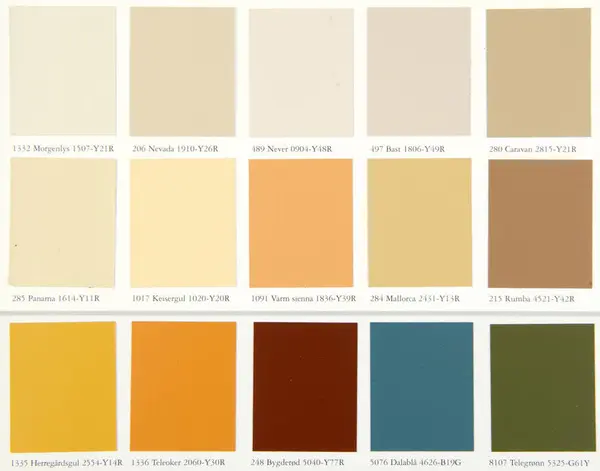 Helt tilbake til 1930-tallet var det vanlig å gi fargene i fargekartene egne navn som skulle gi riktige assosiasjoner til fargen – som «valmuerød», «jadegrønn» og «funkisgul». 1960-tallets utallige fargekart har langt friskere og morsommere fargenavn, som «karneval», «festgul» og «tropegrønn». Tanken var kanskje å skape den riktige stemningen, selv om man neppe følte seg helt hensatt til tropene i en «tropegrønn» stue