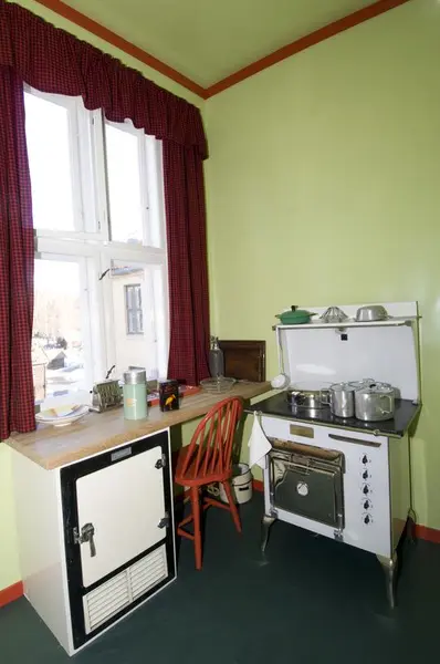 Vågale «funksjonalistiske» fargekombinasjoner i kjøkkenet hos Evelyn Berg i «Slik vil vi bo – 1935». Taket og veggene er «eplegrønne» og listverket «lakkrødt». På gulvet er det ensfarget grønn linoleum. Anne-Lise Reinsfelt | Norsk Folkemuseum