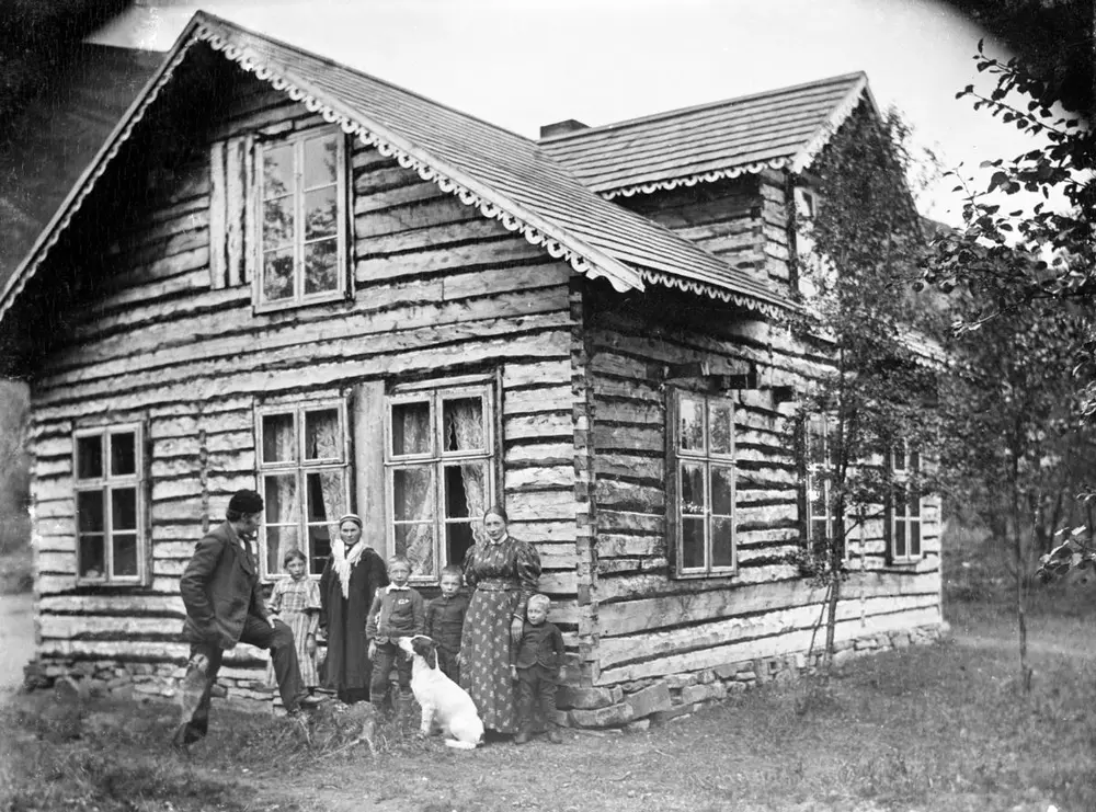 En kvensk familie foran huset sitt i Indre Billefjord, cirka 1900. Ukjent fotograf | Norsk Folkemuseum