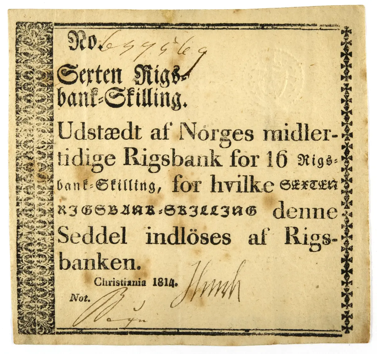 Seksten riksbankskilling fra 1814. Norsk Folkemuseum