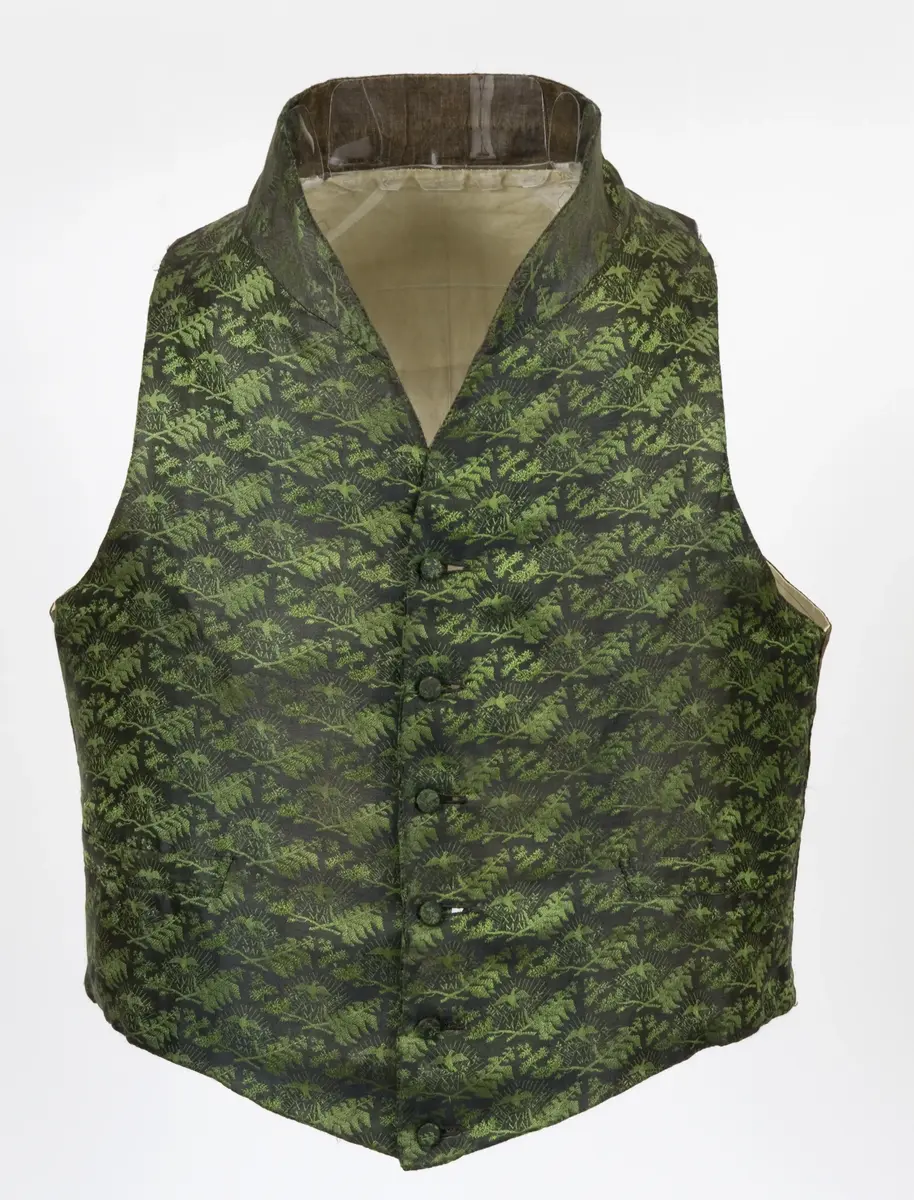 Konstitusjonsvest fra 1827, med 17. mai i romertall (XVII) innvevd i stoffet. Norsk Folkemuseum