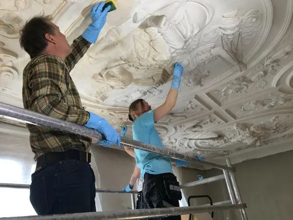 Fargesporene i gipstakene ble avdekket da takene ble rengjort og klargjort for utstilling. På bildet er to av museets objektkonservatorer i gang med å rense «De fire verdensdeler» fra 1662. Cecilie Thue | Norsk Folkemuseum