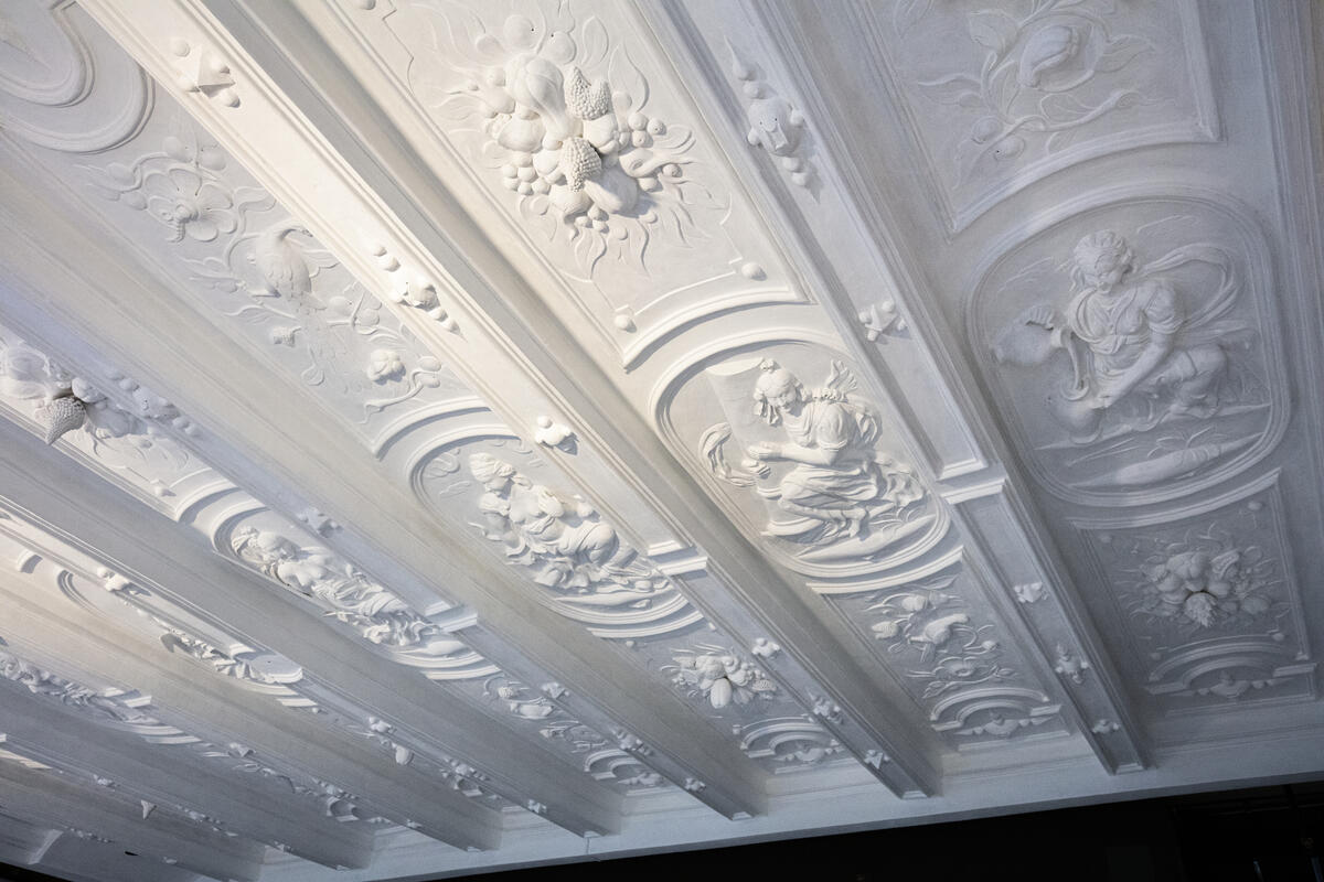 To gipstak fra 1600-tallet vil være noe av det første som møter publikum i Norsk Folkemuseums store nye utstilling «TIDSROM 1600–1914». De to gipstakene, «De syv dyder» og «De fire verdensdeler», befinner seg i utstillingsbygningen «Bybygg», som har vært midlertidig stengt siden 1990-tallet.