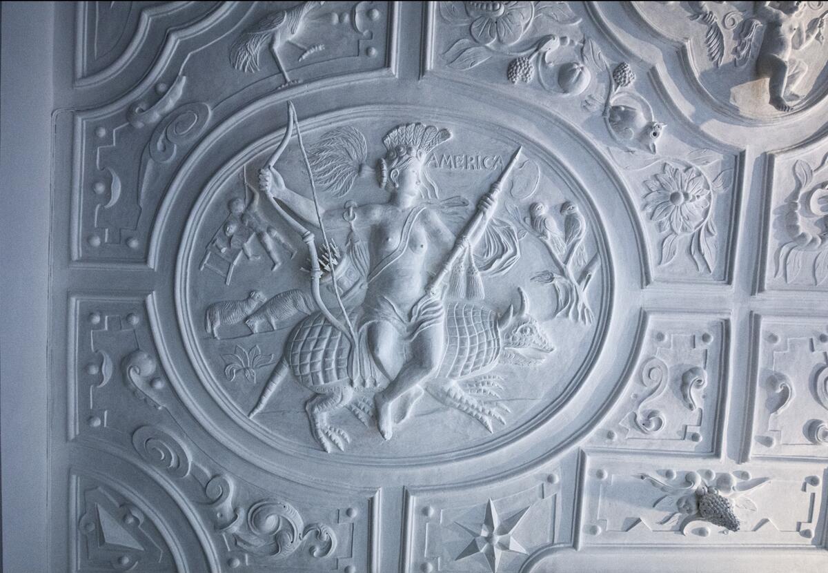 Sammenlignet med de fire verdensdelene i Kungssalen på Skoklosters slott har Norsk Folkemuseums tak flere detaljer, slik vi ser i fremstillingene av Amerika. Uten sikre fargespor er det ikke mulig å bestemme hvilke farger Amerikas fjærpryd, de to papegøyene og andre detaljer en gang kan ha hatt. Haakon Harriss | Norsk Folkemuseum